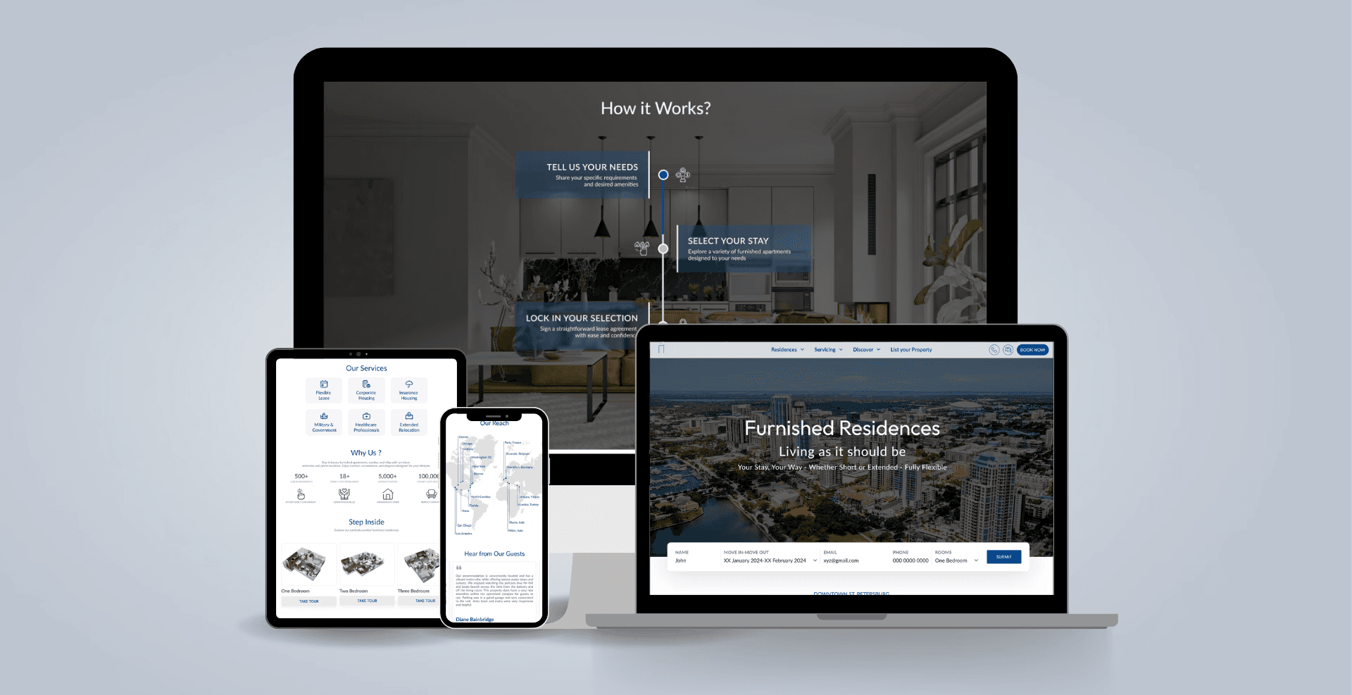 Aries Corporate Housing, a luxury rental service provider, needed a refreshed, accessible, and responsive website that aligned with their brand identity and appealed to a global audience. The previous design lacked modern UX standards, clear information hierarchy, and visual consistency. The challenge was to build a clean, trustworthy digital presence that reflects their premium offerings while keeping the experience intuitive and accessible.
